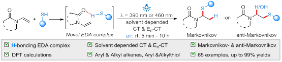华体会(中国)文江伟副教授团队开发了光学活性H-键-S-EDA复合物模型,该EDA复合物模型解决了传统EDA复合物芳基底物的限制,并将其应用在光诱导下羰基活化烯烃的氢硫化和羟硫化。研究发现溶剂化效应是控制H-键-S-EDA复合物经快速电荷转移(CT)还是缓慢能量电荷转移(En-CT)的关键,从而调控位点选择性。