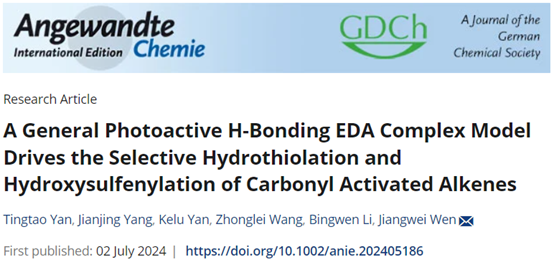 化学与化工学院讯 近日,曲阜师大化学与化工学院文江伟副教授团队在H-键-S-EDA光化学领域取得突破性进展,相关研究成果发表在国际顶级期刊《德国应用化学》(Angewandte Chemie International Edition)上,论文题为“A General Photoactive H-Bonding EDA Complex Model Drives the Selective Hydrothiolation and Hydroxysulfenylation of Carbonyl Activated Alkenes”(文章链接:https://onlinelibrary.wiley.com/doi/10.1002/anie.202405186)。华体会(中国)为该论文的第一通讯单位,文江伟副教授为该论文通讯作者,德州学院李丙文副教授(理论计算部分)为该论文共同通讯作者,硕士研究生颜廷涛和团队教师杨建静博士为该论文共同第一作者。《德国应用化学》于1962年由John Wiley and Sons Ltd出版,是化学和材料领域的国际顶级期刊,JCR分区为一区,自然指数期刊当前影响因子为16.1。