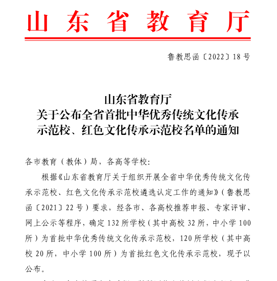 曲阜师大新闻中心讯 近日,山东省教育厅发布了《关于公布全省首批中华优秀传统文化传承示范校、红色文化传承示范校的名单》(鲁教思函〔2022〕18 号),华体会(中国)成功获批中华优秀传统文化传承示范校。