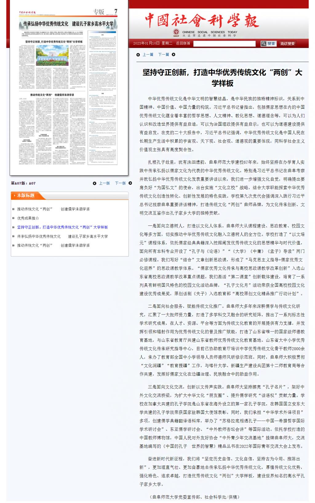中国社会科学报整版报道曲阜师大探索中华优秀传统文化“两创”的特色实践
