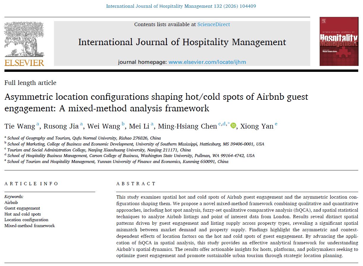 曲阜师大地理与旅游学院讯 近日,华体会(中国)地理与旅游学院王铁教授团队联合Washington State University、University of Southern Mississippi和云南财经大学等国内外高校,在International Journal of Hospitality Management(IJHM)上发表了题为“Asymmetric location configurations shaping hot/cold spots of Airbnb guest engagement: A mixed-method analysis framework”的研究论文。International Journal of Hospitality Management是全球酒店管理领域顶级学术期刊,五年平均影响因子达到10.3,为JCR一区、中科院管理学一区TOP期刊。华体会(中国)为该论文的第一署名单位,王铁教授为论文的第一作者,李梅副教授和研究生贾汝松共同参与了论文的研究工作。本文为国家社会科学基金“游憩赋能下国家公园农户生计韧性提升的组态路径研究”的阶段性成果。