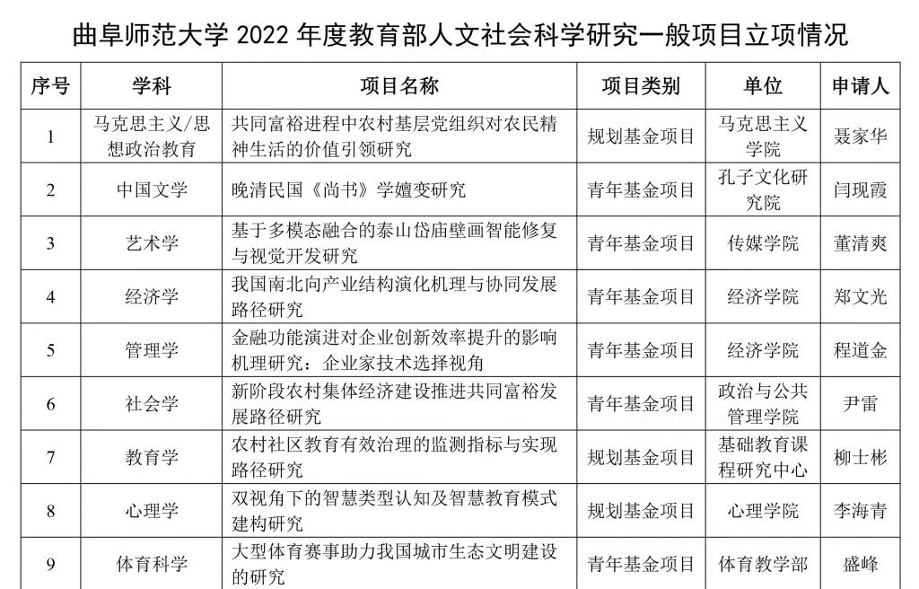 连续五年位列省属高校首位——曲阜师大获立15项2022年度教育部人文社科项...